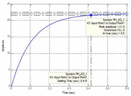 Переходная характеристика характеризует силовую часть электропривода как апериодическое звено с коэффициентом усиления K=21,9.Время переходного процесса в системе равно tпп.зад=0,415 с.