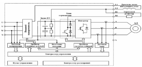 Инвертор, построенный на IGBT-транзисторах, преобразует напряжение звена постоянного тока в переменное напряжение заданной частоты и амплитуды. Блок торможения представляет собой встроенный ключ управления внешним тормозным резистором, подключаемым к клеммам В1 и В2 преобразователя и предназначен для реализации режима динамического торможения двигателя (при необходимости реализации высоких темпов торможения).