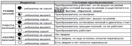 Для дисплея пульта управления могут быть настроены яркость и контрастность, а также автоматическое гашение подсветки дисплея в случае длительного отсутствия нажатия на кнопки. Световые индикаторы "РЕЖИМ", "АВАРИЯ" и "РАБОТА" отображают состояние преобразователя в соответствии с таблицей 3.1.2.