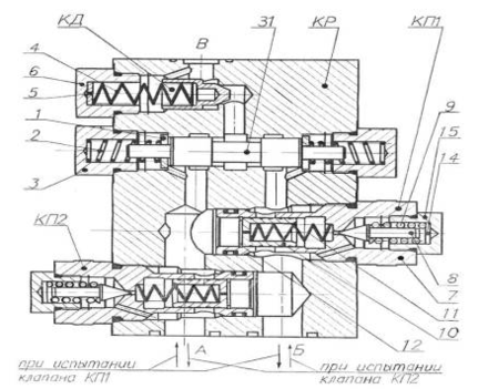 КД – клапан перепускной, 31 золотник, 1 – шайба упорная,