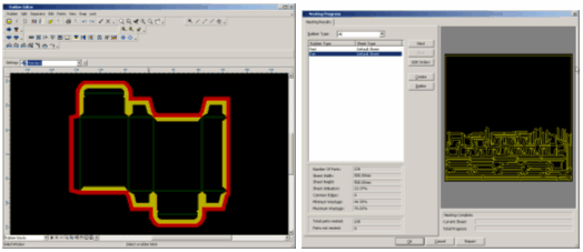 После сборки штанцевой формы (установки режущих линеек в пазы основания) остается финишный процесс – оклейка штанцформы эжекторными материалами (разными сортами резин) для хорошего отделения обработанного листа от штанцформы. Согласно новейшим веяниям в технологии оклейки штанцформы, в некоторых случаях удается существенно сэкономить время и повысить качество штанцформы за счет контурного реза резины. Здесь MarbaCAD также предлагает законченную утилиту для удобного проектирования. На рис. а изображено окно мастера по подготовке контурной резины, а на рис.38 b показано как эта резина будет вырезана из стандартного листа (для 8 коробок).