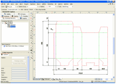 MarbaCAD представляет из себя разветвленную систему проектирования как собственно упаковки так и всей сопутствующей оснастки (штанцформ, контрматриц, оснастки для удаления отходов и разделения заготовок (начиная с 3-й версии)). Имеется встроенная настраиваемая база данных по оборудованию, клиентам, пользователям, материалам и т.д. Основное окно программы выглядит традиционно для таких приложений: большое рабочее поле и ряд выпадающих меню и настраиваемых кнопочных панелей (рис.18).