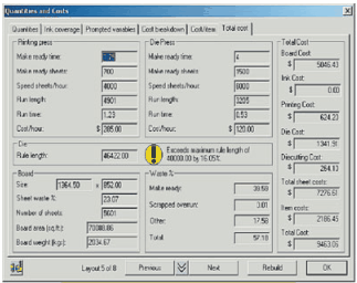 Cost/Estimating с помощью интеллектуальных алгоритмов производит подсчеты производственных расходов для различные вариантов размещения раскроев упаковки на листе. Для работы модуля необходимо задать параметры расходных статей. Программа делает калькуляцию расходов на подготовку и выполнение заказа в зависимости от тиража для каждой статьи расходов. В частности, рассчитывает расход каждой краски в зависимости от запечатываемой площади. Редактор интеллектуальных алгоритмов позволяет задать производственные параметры для расчетов путем выбора из таблиц. Например, скорость работы офсетной машины задается в зависимости от красочности заказа и тиража. Или степень сложности высекальной оснастки влияет на скорость высекальной машины. Программа может подсчитать расходы в зависимости от тиража, а это часто требуется для подготовки коммерческого предложения на изготовление упаковки. Окончательная калькуляция расходов позволяет увидеть общую стоимость или с разбивкой по статьям расходов.