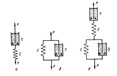 Помимо модели Максвелла (рисунок 1,а), состоящей из последовательно соединенных элементов: упругого Е и вязкого η, для описания процессов ползучести используют модель Кельвина-Фойгта (рисунок 1,б), состоящую из параллельно соединенных элементов Е и η, а также комбинации моделей Кельвина-Фойгта, Максвелла и упругих элементов. Так, при описании ползучести и релаксации, согласно комбинированной гипотезе ползучести, предложенной Е. А. Хейном, использована модель рисунок 1,в. Она состоит из звена Максвелла, описывающего необратимую ползучесть, и совокупности звеньев Кельвина-Фойгта, моделирующих упругое последействие.