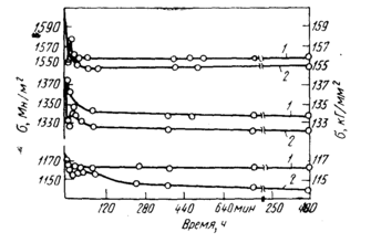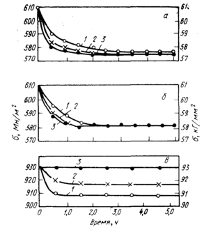 При повышении температуры на процесс релаксации напряжений оказывают влияние такие явления, как рекристаллизация, возврат, старение. В этих условиях решающее значение приобретает временной фактор. По истечении некоторого промежутка времени, зависящего) от температуры, упрочняющее действие ТМО утрачивается и преимущество получает материал, не подвергавшийся ТМО.