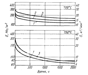 Описанные превращения способствуют сохранению сопротивления ползучести на достаточном уровне даже при столь высокой для стали этого класса температуре, как 750°С. Однако в условиях релаксации напряжений замена фазы Ni3Тi фазой Fe2W лишь несколько затормаживает разупрочнение стали при температуре 750°С. По истечении 1000 ч оставшееся напряжение составляет всего 35—40% от начального (рисунок 21, б). Можно полагать, что структурная нестабильность данной стали при 750°С является в условиях релаксации отрицательным фактором.