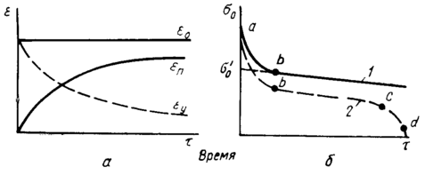 С течением времени в нагруженном теле, поставленном в условии неизменности начальной суммарной деформации, упругая деформация снижается и соответственно этому растет пластическая деформация. Уменьшение упругой деформации (упругих искажений кристаллической решетки) влечет за собой снижение (релаксацию) напряжений. Это наглядно показано на рисунке 2,а, на котором дана схема уменьшения упругой деформации и соответственного роста пластической, а на рисунке 2,6 — кривая релаксации напряжений.