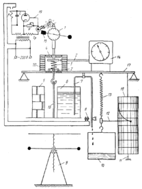 1— индикаторная головка; 2— термопара; 3 — испытуемая пружина; 4 — тяга; 5 —гиря; 6 — гидрогиря; 7 — резиновая трубка; 8 — электромагнитный пережим; 9 — домкрат; 10 —ведро; 11 — ось электрочасов; 12 — указывающая и записывающая стрелки; 13 — весоизмерительная пружина; 14 — потенциометр ЭМД-237; 15—стрелка-флажок; 16 — грузовая подвеска; 17 — стол установки; 18 — записывающие барабанные электрочасы; 19— фотореле; 20 — электропечь