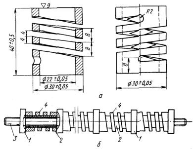 В последние годы Чижиком А.А. разработан метод испытания на релаксацию металла натурных пароперегревательных труб. Испытания проводят в условиях сжатия на специальных пружинных образцах с прямоугольным сечением витка рисунок 14. Применительно к условиям получения достаточной точности испытаний и предупреждения потери устойчивости для труб диаметрами 25—75 мм установлены оптимальные размеры пружинного образца: длина 40, шаг спирали 8 мм. Образцы обычно изготовляют фрезерованием и каждый образец подвергают тарировке, состоящей в определении усилия, необходимого для осадки образца до высоты, соответствующей длине калибра. В результате тарировки определяют жесткость образца