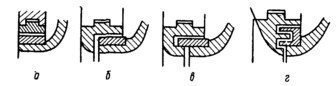 Полностью разбирают насос и тщательно осматривают его детали. Обо всех дефектах отмечают в журнале. Проверяют осевой разбег ротора в корпусе. До установки радиально-упорных подшипников осевой разбег составляет 8—10 мм. После их установки и затяжки (то есть фиксации ротора) осевой люфт в пределах 0,1 - 0,2 мм. Зазор между деталями ротора и корпусом насоса должен быть 4—6 мм. Проверяют зазоры в уплотнениях ротора и корпуса насоса. На рис. 3 приведены наиболее широко распространенные конструкции уплотнительных колец центробежных насосов на магистральных трубопроводах.