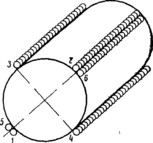 Чтобы не допустить тепловой деформации (коробления) вала, сварку выполняют по спирали при постоянной скорости вращения вала. При продольном наложении швов окружность делят на четыре части и сварку ведут поочередно через 1800 (рис.7).