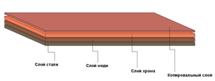 Основное отличие монометаллических форм от биметаллических в том, что печатающие и пробельные элементы монометаллических форм находятся на одной и той же металлической поверхности. На биметаллических формах печатающие элементы располагаются на одном металле (обычно меди), а пробельные — на втором металле (хром, реже никель). То есть биметаллические пластины состоят из двух металлических слоев, последовательно нанесенных на металлическую или полиэфирную подложку, и светочувствительного слоя (рис. 3) [10].