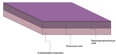 Состоят из трёх слоёв: алюминиевой подложки, печатного слоя и термочувствительного слоя, который имеет толщину менее 1 мкм, т.е. в 100 раз тоньше человеческого волоса (рис. 10).