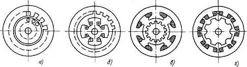 Мал. 2. Основні конструктивні виконання електричних машин: а - асинхронна; б - синхронна; в - колекторна; г - індукторна