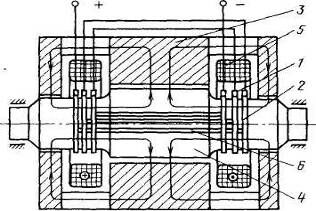 Гнітюче число машин постійного струму виконується з колектором - механічним перетворювачем частоти. Але існує кілька типів і безуважних машин, наприклад уніполярні генератори (мал. 5), які використовуються для одержання більших струмів (до 100 ка) при низьких напругах. У таких машинах колектор відсутній, але вони можуть працювати тільки при наявності ковзного контакту, що складається із щіток 1 і кілець 2. Постійний магнітний потік, створений струмами обмотки збудження 5, замикається по станині 3, масивному ротору 4 і двом зазорам. Постійні струми наводяться в масивному роторі й знімаються щітками. Щоб зменшити електричні втрати в роторі, у ньому роблять пази, у які укладають мідні стрижні 6. Стрижні, приварені до контактних кілець, утворять на роторі короткозамкнену обмотку.