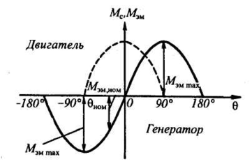 Для явно полюсного двигуна залежність Мс, Мэм = f (0) має такий же вид, як і для генератора, але розташовується в зоні негативних кутів и. [6, с. 432]