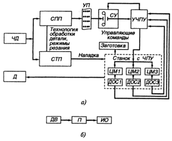 Структурная схема системы ЧПУ представлена на рисунке 1, а. Чертеж детали (ЧД), подлежащий обработке на станке с ЧПУ, одновременно поступает в систему подготовки программы (СПП) и систему технологической подготовки (СТП). Последняя обеспечивает систему подготовки программы данными о разрабатываемом технологическом процессе, режимах резания и так далее. На основании этих данных разрабатывается управляющая программа (УП). Наладчики устанавливают на станок приспособления, режущие инструменты согласно документации, разработанной в системе технологической подготовки. Установку заготовки и снятие готовой детали осуществляет оператор или автоматический загрузчик. Считывающее устройство (СУ) считывает информацию с носителя программы. Информация поступает в устройство ЧПУ, которое выдает управляющие команды на целевые механизмы (ЦМ) станка, осуществляющие основные и вспомогательные движения цикла обработки. Операционная система на основе информации (фактическое положение, скорость перемещения исполнительных узлов, фактический размер обрабатываемой поверхности, тепловые и силовые параметры технологической системы и др.) контролируют величину перемещения целевого механизма. Станок содержит несколько целевых механизмов, каждый из которых включает в себя (рисунок 1, б): двигатель (ДВ), являющийся источником энергии; передачу (П), служащую для преобразования энергии и ее передачи от двигателя к исполнительному органу (ИО); собственно исполнительный орган (стол, салазки, суппорт, шпиндель и т.д.), выполняющие координатные перемещения цикла.