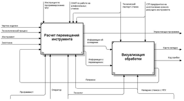 Первый модуль занимается расчетом перемещений инструмента, учитывая технологические и технические ограничения. Все входные данные поступают именно на этот модуль и соответственно все их преобразования также происходят в этом модуле. В связи с этим, этот модуль должен работать со всеми выше перечисленными документами. Работать с этим модулем должны также все выше перечисленные люди.