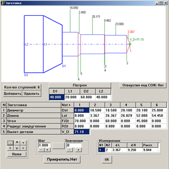 Форма и положение заготовки относительно патрона имеют первостепенное значение для проведения корректной обработки шлифованием, исключения брака и аварийных ситуаций. Предложенная схема введения размеров заготовки обеспечивает создание тела вращения различной конфигурации, образующими формы которого могут быть наборы прямых линий и сопряженных с ними окружностей. Ступенью в данной схеме является отдельно взятый отрезок прямой с началом в точке, обозначенной числом равным номеру ступени. Эти числа расположены вместе с вертикальными указателями на нижней части профиля заготовки. Все изменения параметров патрона и заготовки отображаются на верхнем графическом поле. Изменение значения параметра производится непосредственно в соответствующей ячейке таблицы или с помощью вспомогательных параметров "Шаг" и "Значение". В верхней части заготовки проставлены указатели с расстояниями между соседними ступенями и значениями углов указанной ступени к оси заготовки. В нижнем правом углу, в блоке "Измерения" находятся значения осевых, радиальных перепадов и расстояний между двумя произвольными точками контура заготовки. Кнопка "Прикрепить" имеет три режима: "Нет", "Справа" и "Слева". Это означает, что при изменении параметров контур справа или слева от рассматриваемой ступени может меняться по-разному. Добавление и удаление ступеней желательно не делать на первой и последней ступенях, иначе может произойти разрушение топологии контура заготовки. В случае любой непонятной ситуации можно применить откат вперед или назад (до 20 шагов) кнопками "Undo" и "Redo". Для заготовок с отверстиями под СОЖ предусмотрена упрощенная схема отображения отверстий в графическом поле. После ввода всех необходимых параметров и нажатия кнопки "ОК", генерируется программа для создания 3-d моделей патрона и заготовки. Следующим этапом является создание наладки инструмента (рисунок 14).