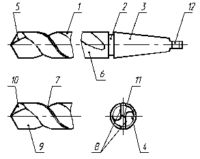 Спиральное сверло, рис. 7.1 из быстрорежущей стали Р6М5 состоит из рабочей части 1, хвостовика 2 и шейки 3. На рабочей части сверла образованы две спиральные канавки 4. Рабочая часть включает режущую 5 и цилиндрическую 6 части с двумя ленточками 7. Режущая часть содержит две режущие кромки, образованные пересечением передней 9 и задней 10 поверхностей, а также перемычку 11. Хвостовик с лапкой 12 служит для закрепления сверла.