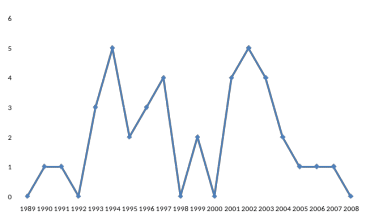 Рисунок 3. Количество патентов по странам поиска за 1989 – 2008 гг.