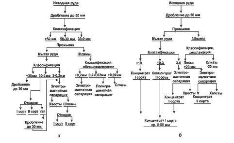 Рис.1.1 Принципиальная технологическая схема обогащения марганцевых руд: а - окисных; б – карбонатных
