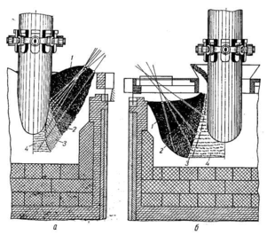 Отличие открытой и закрытой печей состоит в отсутствии на открытой печи водоохлаждаемого металлического свода. Это определило место подачи шихты по труботечкам в печь: на закрытой печи шихта подавалась в загрузочные воронки электродов, а на открытой — шихта поступала непосредственно на колошник. Представление о геометрических размерах зон превращения шихты в открытой и закрытой печах можно получить из рассмотрения рис. 1.2.