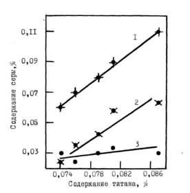 По среднегодовым анализам этих двух сплавов получена зависимость, отражающая влияние кремния и титана на массовую долю серы: