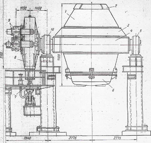 5 – опора с плавающим подшипником; 6 – днище отъемное; 7 – буферное устройство; 8 – редуктор специальный; 9 – редукторы навесные с электродвигателями; 10 – опора с неподвижным подшипником;