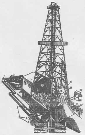 Мал. 1 - Загальний вид бурової установки: 1- приймальна ємкість; 2 - бурові насоси; 3 - нагнітальна лінія; 4 -силовий блок; 5 - буровий рукав; 6 - вертлюг; 7 - лебідка; 8 - провідна труба; 9 - індикатор ваги; 10 - машинні ключі; 11 - стояк; 12 - ключ Акб-зм2; 13-свічник; 14 - ротор; 15 - превентор; 16 - ручний привід превентора; 17 - трубний стелаж; 18 - вихід розчину в жолоб.