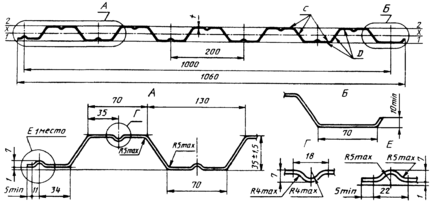 Разность ширины крайних узких полок гофров профилированных листов должна быть не менее 2 мм.