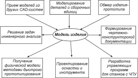 Построение пространственной геометрической модели проектируемого изделия является центральной задачей компьютерного проектирования. Именно эта модель используется в CAD/CAM-системе для дальнейшего решения задач формирования чертежно-конструкторской документации, проектирования средств технологического оснащения, разработки управляющих программ для станков с ЧПУ (рис. 3). Кроме того, эта модель передается в САЕ-системы и используется там для проведения инженерных исследований. По компьютерной