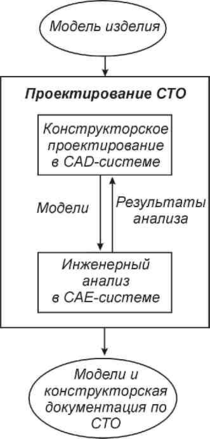 На рис. 5 приведена общая схема совместного использования CAD- и САЕ-систем применительно к задаче проектирования средств технологического оснащения. Разрабатываемые в CAD-системе конструкторские решения подвергаются исследованиям с помощью САЕ-системы. По результатам исследований выполняются соответствующие изменения конструкции или параметров проектируемой оснастки. При
