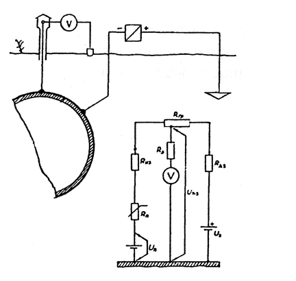 Рис. 3.5 Измерение поляризационного потенциала в специальных контрольно-измерительных пунктах, оборудованных долгодействующим электродом сравнения и вспомогательным электродом