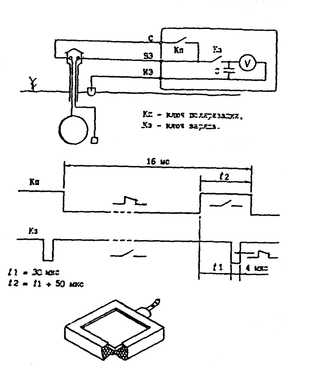 Коммутирующее устройство состоит из накопительного конденсатора емкостью 4,7 мкФ и реле, обеспечивающего попеременную коммутацию цепей «датчик – трубопровод» и «датчик – электрод сравнения». Этот метод не требует отключения системы ЭХЗ. Для измерения применяют приборы: ПКО, ПКИ-02, мультиметр 43313.1, которые совмещают в себе вольтметр и коммутирующее устройство. Продолжительность коммутации цепи «датчик электрод сравнения» не менее 5 мс, продолжительность коммутации цепи «датчик - трубопровод» не менее 50 мс. Вспомогательный электрод представляет собой стальную пластину определенного размера. Одну из сторон пластины изолируют. Плоскость датчика при установке должна быть ориентирована перпендикулярно оси трубы. Важно, чтобы датчик был максимально приближен к трубе. При проведении измерений по этому методу в измеряемую величину всегда входит и падение напряжения (градиент поля токов катодной защиты) между электродом сравнения и датчиком. Поэтому необходимо, чтобы электрод сравнения был максимально приближен к датчику, но при этом не экранировал его.