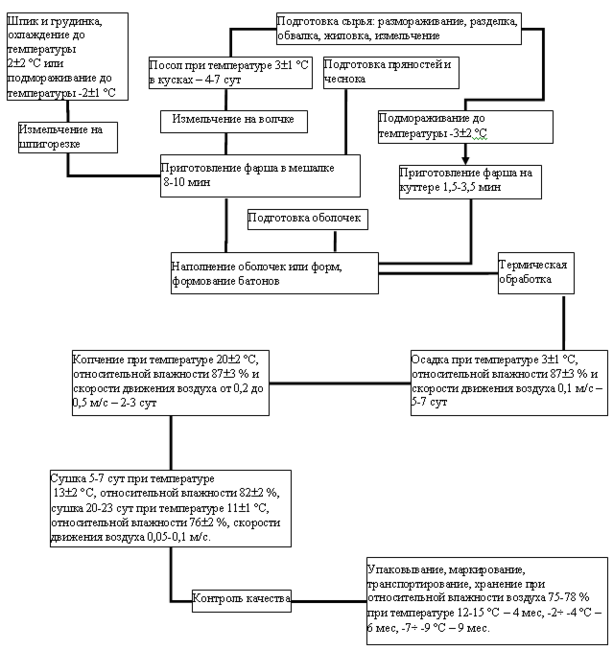 Схема 2. Технологический процесс производства сырокопченых колбас