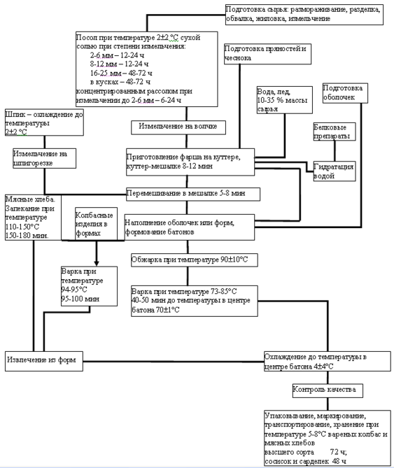 Схема 1. Технологические процессы производства вареных колбас, сосисок, сарделек и мясных хлебов