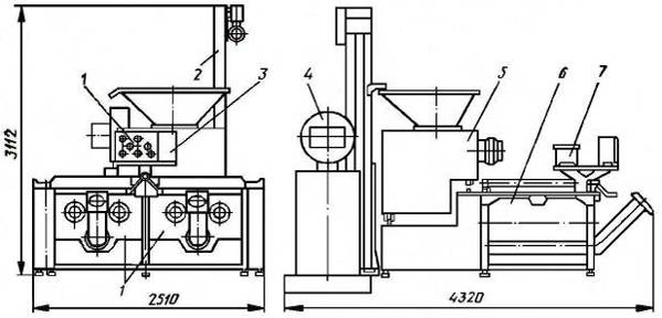 1 – электрооборудование; 2 – подъемник; 3 – пульт управления; 4 – устройство выбора дозы; 5 – измельчитель; 6 – двухсекционная фаршемешалка; 7 – дозатор рассола