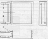 Рис. 4. Конструкция водяного трубчатого воздухоохладителя: 1 — кожух из оцинкованной стали; 2,3 — входной и выходной патрубки коллектора с резьбой; 4 — медные трубки с алюминиевым пластинчатым оребрением.