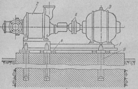 Насосы в большинстве случаев поставляют на монтажную площадку в виде насосного агрегата. Насос и электродвигатель устанавливают на заводе на обшей обработанной чугунной плите, валы соединяют муфтой и центруют.