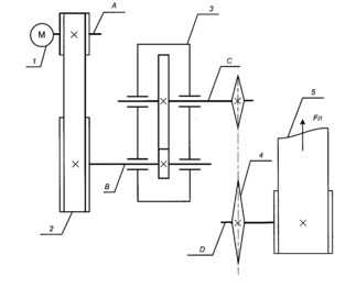 А - вал электродвигателя; В - I вал редуктора; С - II вал редуктора; D - вал приводного барабана.