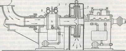 1 — неподвижный диск; 2— вращающийся диск; 3 — вход массы; 4 — гидравлический