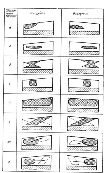 Пятно контакта имеет нужные размеры, форму и расположение, но при изменении взаимного положения шестерни и колеса оно смещается не вдоль зуба, а с перекосом – на его головку или ножку (фиг. 6.2, ж).