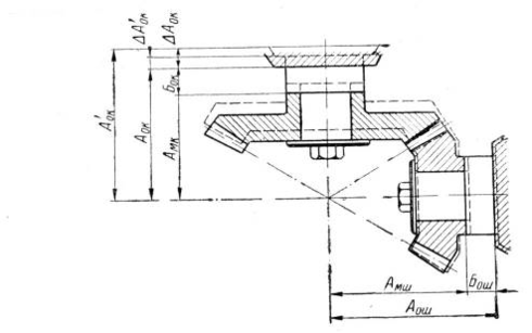Для проверки пятна контакта [5] шестерня и колесо устанавливаются на контрольно-обкатном станке по номинальным осевым установкам АМК и АМШ при этом отсчитываемые на шкалах станка размеры АОК и АОШ должны быть взяты с учетом высоты буртов оправок БОК и БОШ (фиг. 6.1). Между зубьями в зацеплении должен быть боковой зазор.