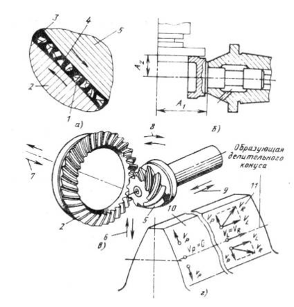 Пятно контакта при притирке конических передач при наличии на зубьях 10 только профильного скольжения Vp, прогрессивно увеличивающегося от делительной линии к головке и ножке зуба (рис. 6.4, г), имеет тенденцию к сужению и располагается вдоль линии делительного конуса. Для компенсации этого явления обычно увеличивают базовое расстояние шестерни на 0,075–0,125 мм, что способствует смещению пятна контакта у шестерни к ножке зуба. У гипоидных передач на поверхности зубьев 11 наряду с профильным Vp происходит также продольное скольжение VL (рис. 6.4, г). Поэтому при их притирке пятно контакта под действием результирующего скольжения VR имеет склонность к расширению по высоте профиля.