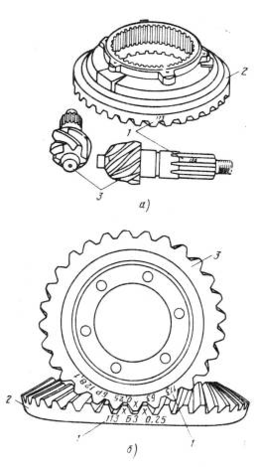 После химико-термической обработки в результате деформирования качество зацепления [6] и стабильность размеров зубьев гипоидных и конических колес в значительной степени снижаются. Форма и расположение пятна контакта, уровень шума и боковой зазор между зубьями даже в одной партии зубчатых колес неодинаковы. Поэтому в технологическом процессе изготовления конических зубчатых колес выполняют подбор в пары, который предназначен для определения двух сопряженных элементов – шестерни и колеса, качество зацепления которых соответствует требованиям чертежа. После подбора в пары и достижения требуемого качества шестерня и колесо должны оставаться сопряженными в течение всего периода эксплуатации. При поломке одного из элементов пары заменяют весь комплект.