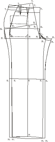 | Расположение вытачек | Т5Т7 | Т5Т7 соед. с небольшим прогибом, продолжив линию вверх на 1,5 см. т. Б ст. Я7 прямой, т. Я7 с т. К3 с Н3 соединение прямой линией Я7 прямой, т. прогибом, продолжив линию вверх на 1,5 см. | |||