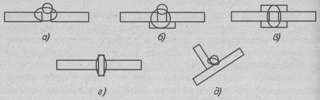 Рис. 2.2. Зварювання вугільним електродом з попередньою укладкою прутків і смужок: а - односторонній стиковий шов з укладанням прутка; б - те ж, з укладанням прутка і підкладкою смужки під шов; в - двосторонній стиковий шов з укладанням смужок з обох сторін; г - те ж, з укладанням смужки в зазор між зварюються листами; д - односторонній кутовий шов з укладанням прутка.