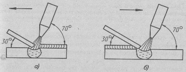 Зварювання з подачею присадочного металу в дугу може проводиться за однією з двох схем - лівий або правий спосіб за рис. 2.1, а і б.