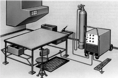 Для складання і зварювання деталей усередині кабіни встановлюють металевий зварювальний стіл висотою 500 ... 600 мм для роботи сидячи і близько 900 мм для роботи стоячи площею близько 1м2. До столу приварюють сталеві болти для кріплення струмопідвідних проводів від джерела зварювального струму і для проводу заземлення столу. Збоку столу є гнізда для зберігання електродів. У шухляді столу зберігають інструмент, а також технологічну документацію. Для зручності роботи в кабіні встановлюють металевий стілець з підйомним сидінням, виготовленим з неелектропровідного матеріалу (дерево, пластмаса та ін.) Під ногами у зварника повинен знаходитися гумовий килимок.